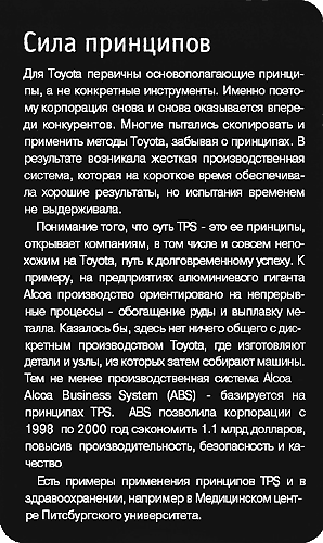 Toyota - одна из самых именитых компаний в мире. Она из года в год опережает конкурентов по таким показателям, как качество, надежность, производительность, объем продаж, минимизация издержек, рост рыночной доли и капитализации. В конце прошлого года Toyota чуть было не обошла входящую в ''большую тройку" DaimlerChrysler, почти догнав ее не только по объему продаж, но и по объему производства. По доле на мировом автомобильном рынке она недавно опередила Ford и заняла второе место, а по объему чистой прибыли и рыночной капитализации (данные на конец 2003 года) вышла на первое место. Секреты высокой эффективности японской корпорации пытаются разгадать руководители бизнеса, аналитики и журналисты. Возникает вопрос: если все так тщательно изучают и копируют методы Toyota, то почему мы почти не встречаем компаний, сумевших сравняться с ней по эффективности? Несколько лет назад мы с Кентом Бауэном опубликовали статью "Расшифровка ДНК-кода производственной системы Toyota" (Decoding the DNA of the Toyota Production System. HBR, сентябрь - октябрь. 1999). В ней говорилось, что подражатели стремятся скопировать прежде всего конкретные методы и инструменты Toyota (например, карточки канбан или производственные ячейки), вместо того чтобы перенять и освоить базовые организационные принципы. Нам удалось выявить четыре принципа, лежащие в основе производственной системы корпорации, которые создают условия для постоянного повышения надежности, гибкости, безопасности, эффективности производства и в итоге - рыночной доли и прибыльности компании. Мы старались показать, что главное достижение Toyota не в создании и внедрении инструментов как таковых, а в превращении всей производственной деятельности в цепочку экспериментов, встроенных в рабочий процесс. Эксперименты проводятся на всех его этапах и уровнях - от самых простых операций (типа установки автомобильных сидений) до самых сложных и масштабных (вроде запуска новой модели или даже нового завода). Всем известное стремление Toyota к стандартизации, говорилось в нашей статье, направлено не на усовершенствование контроля и даже не на воспроизведение "лучшей практики". В Toyota скрупулезное следование предписаниям сочетается с экспериментированием в процессе работы. Такой подход позволяет немедленно, прямо в ходе эксперимента понять, в чем состоит проблема. При этом удается более глубоко изучить производимый продукт, а также производственный процесс и его участников, после чего формируется новое предписание, которое становится ''лучшей практикой" - естественно, до тех пор, пока не обнаружатся новые проблемы (см. врезку "Сила принципов").
