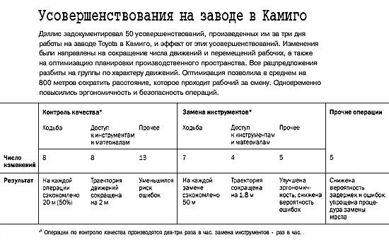 Мастер-класс. После того как Дэллис провел на американском заводе Toyota 12 недель, Такахаси счел, что новый сотрудник овладел искусством наблюдения за людьми и машинами и научился решать проблемы, ставя серии экспериментов. Вместе с тем наставника беспокоило, что Дэллис многое делает самостоятельно, не подключая рабочих, и слишком долго тестирует нововведения. Такахаси решил, что пора показать стажеру, как Toyota осуществляет усовершенствования на родной земле, и они полетели в Японию. Первые три дня Дэллис должен был провести на знаменитом заводе по производству двигателей в Камиго, в том самом месте, где Тайити Оно, один из создателей TPS, разработал и внедрил свои знаменитые инновации. В день прибытия Такахаси преподнес своему подопечному первый сюрприз: наблюдая за рабочим одной из производственных ячеек, Дэллис должен был сделать 50 усовершенствований. На каждое усовершенствование, таким образом, отводилось всего 22 минуты, а не целый рабочий день, как раньше. Изначально перед Дэллисом была поставлена задача снизить нагрузку на рабочего - уменьшить количество перемещений и движений, не увеличивающих стоимости продукта, утомляющих оператора и удлиняющих операционный цикл. Такая формулировка задачи неслучайна: фокусирование на снижении нагрузки означало, что надо оптимизировать рабочий процесс. Если бы речь шла о сокращении потерь времени, то подразумевалось бы. что проблема в человеке. На новом месте Дэллис использовал принципы, усвоенные на заводе в США В первый день он потратил три часа, наблюдая за напарником. К концу смены он с гордостью доложил, что у него появилось семь идей и четыре из них уже реализованы. И туг Такахаси преподнес второй сюрприз, сообщив, что два японских стажера, претендующих на менее значительные должности, чем Дэллис, за то же время успели сделать гораздо больше: один из них внес 28 рацпредложений, другой - 31. Дэллис постарался ускорить поиски возможностей для оптимизации, перейдя на более быстрые и "грязные" методы тестирования: сварку заменяли болтовым креплением, вместо крепления болтом использовали веревку а то и без нее обходились - просто поддерживали деталь руками. Словом, делали все, чтобы быстрее увидеть результаты изменений. К утру второго дня Дэллис с напарником подготовили список уже из 25 идей. Такахаси время от времени заходил в цех, спрашивал, что Дэллис обдумывает в данный момент, задавал очень детальные вопросы. "Прежде чем я успевал что-либо объяснить, - вспоминает Дэллис, - он отправлял меня проверить изменение на практике". Стажер убедился, что теперь он куда быстрее обнаруживает и решает проблемы. Утром третьего дня он смог перейти от изучения отдельных операций к анализу организации производственной ячейки в целом. "На участке были две машины, оснащенные приборными панелями, а также стойки с комплектующими, - рассказывает Дэллис. - В одном случае для замены инструмента требовалось восемь шагов, в другом - двадцать четыре. Я подумал а нельзя ли изменить компоновку оборудования так. чтобы сократить число шагов, а значит, и время выполнения операции? Мы сумели смоделировать изменение, не прибегая к перестановке тяжелых машин". К концу третьего дня Дэллис выявил 50 недоработок в системе контроля качества, в схеме замены инструментов и прочих составляющих производственного процесса, прич